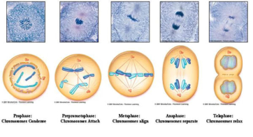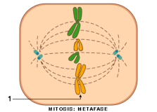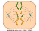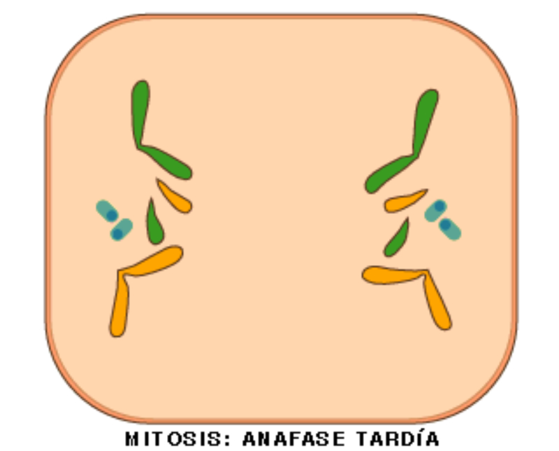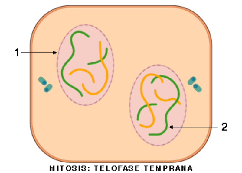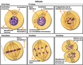 La mitosis es un proceso por el que el núcleo de la célula eucariota se divide en dos núcleos, cada uno conteniendo el mismo número de cromosomas que la célula original.Aunque la mitosis es un proceso continuo, para sus estudio se divide en 4 etapas: profase, metafase, anafase y telofase.PROFASEEl ADN en forma de cromatina comienza a condensarse, formándose los cromosomas y haciéndose visible. El nucleolo desaparece.En células animales los centríolos se duplican y comienzan a formar entre ellos una serie de microtúbulos, el huso mitótico. El crecimiento de estos microtúbulos, que se unirán a los cromosomas por los centrómeros, impulsa a cada pareja de centríolos a un polo de la célula. En células vegetales el huso se forma a partir de los centrosomas.La membrana nuclear empieza a desintegrarse y, al final de esta fase, habrá desparecido.METAFASELos cromosomas, arrastrados por los microtúbulos del huso, se disponen en la zona ecuatorial de la célula, formando la placa ecuatorial o placa metafásica. Los cromosomas alcanzan el mayor grado de condensación y son visibles las dos cromátidas (copias de ADN en cada cromosoma).ANAFASELos microtúbulos del huso se acortan y tiran de cada cromátida hermana hacia uno de los polos. Los cromosomas (ahora formados por una única cromátida) se denominan cromosomas anafásicos.TELOFASELas cromátidas alcanzan los polos de la célula y comienzan a descondensarse en cromatina. El huso mitótico desaparece y se forman las membranas nucleares de los nuevos núcleos.