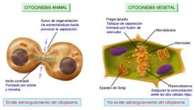 Una vez dividido el núcleo, para completar la división celular debe dividirse el citoplasma y repartir los orgánulos. Este proceso se denomina citocinesis y es diferente en células animales y vegetales.CÉLULA ANIMALLa citocinesis se produce por la aparición de un anillo contráctil en mitad de la célula. El anillo se estrecha y se da un estrangulamiento (surco de segmentación)celular hasta que queda dividida en dos.CÉLULA VEGETALLa presencia de una pared rígida impide el estrangulamiento. Para separar a las células hijas, en el centro de la célula se acumulan vesículas producidas en el aparato de Golgi (fragmoplasto). Estas vesículas vierten los componentes de la nueva pared, formando un tabique que separará a las células hijas.