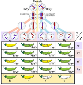 La tercera ley de Mendel o ley de la herencia independiente de los caracteres sostiene que los caracteres diferentes se transmiten de forma independiente. Para establecer este resultado, Mendel realizó cruces entre plantas puras para dos caracteres y observó las dos primeras generaciones. La F 1 cumplía la primera ley y eran todos iguales, con los dos caracteres dominantes. Eran dihíbridos. En la F 2 , en contra de lo esperado, aparecieron todas las combinaciones posibles entre los dos caracteres, en una proporción: 9:3:3:1. Esta ley se sabe actualmente que sólo se cumple en casos particulares.