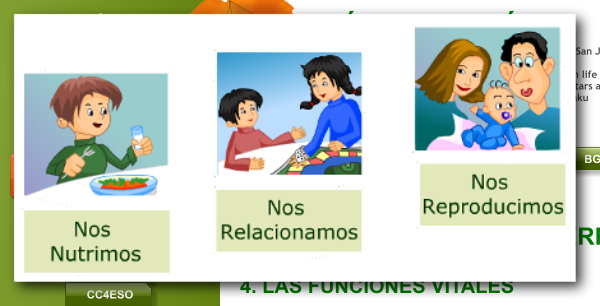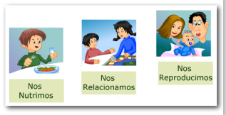Los seres humanos presentan ciertas características comunes a todos los seres vivos: están formados por células, tienen una composición química particular y realizan las tres funciones vitales típicas: nutrición, relación y reproducción.A.Nutrición: consiste en el intercambio de materia y energía con el medio. Los seres vivos toman materia y energía del medio y expulsan materia y energía como desechos.En organismos unicelulares o con pocas células, cada célula realiza esta función de forma más o menos independiente.En organismos pluricelulares de mayor tamaño es necesario que intervengan varios aparatos: digestivo, respiratorio, circulatorio y excretor.Existen básicamente 2 tipos de nutrición en los seres vivos:•Autótrofa: consiste en obtener materia orgánica a partir de la inorgánica. Una modalidad es la fotosíntesis, propia de plantas, algas y ciertas bacterias. Utilizan CO2, H2O y energía luminosa para fabricar compuestos orgánicos.•Heterótrofa: la materia orgánica se obtiene a partir de otros seres vivos. Es típica de animales, hongos y la mayoría de las bacterias.B.Relación: consiste en un intercambio de información con el medio interno o externo. Los organismos reciben información (estímulos) de los cambios del medio y responden apropiadamente para adaptarse a dichos cambios.En organismos unicelulares o muy sencillos, cada célula responde de forma independiente a los cambios del medio. En seres pluricelulares complejos, como el ser humano, intervienen sistemas como el nervioso y el endocrino.C.Reproducción: es la capacidad que tienen los seres vivos para hacer copias de sí mismos.A diferencia de las otras funciones, la reproducción no es indispensable para la supervivencia de los individuos, pero sí para mantener la especie a lo largo del tiempo y, en definitiva, para perpetuar la vida.En organismos unicelulares, la división de la célula equivale a la reproducción. En los pluricelulares es más complicado. Puede darse a partir de un fragmento del organismo (reproducción asexual) o mediante células especiales llamadas gametos (reproducción sexual).Las células de los organismos sexuales pueden dividirse mediante dos mecanismos:a.Mitosis: la realizan las células somáticas (no sexuales) y contribuye al crecimiento y renovación de tejidos. Es una bipartición en que una célula madre origina dos células hijas idénticas.b.Meiosis: es un tipo especial de división celular que sólo se realiza en las gónadas u órganos sexuales (ovarios y testículos). Sirve para fabricar gametos o células sexuales (óvulos y espermatozoides), células con la mitad del material genético de la célula original. De esta forma, cuando se juntan dos gametos se forma una célula con todo el material genético.