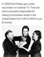 Elvis y las vacunasEn 1956 Elvis Presley se vacunó de la polio en televisión. Este simple hecho hizo que el porcentaje de inmunización en los EEUU pasase del 0,6 % al 80 % en sólo 6 meses.