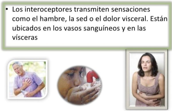 Los receptores pueden clasificarse según varios criterios.Así, según dónde se encuentran, tenemos:Receptores internos o interorreceptores: en el interior del cuerpo. Captan el estado general del cuerpo. Producen la sensación de sed, hambre, mareo, posición, dolor…Receptores externos o exterorreceptores: en la superficie corporal. Recogen estímulos del exterior. Los principales son los órganos de los sentidos, agrupaciones de receptores muy complejas. Perciben el tacto, luz, sonido, olor,…Por otra parte, también se pueden clasificar según el tipo de estímulo captado:Quimiorreceptores: perciben sustancias químicas disueltas en agua o en el aire. Boca y nariz principalmente.Mecanorreceptores: detectan estímulos físicos como la presión, la gravedad o el sonido. Piel y oído.Fotorreceptores: detectan la luz y distinguen colores. Ojos.Termorreceptores: sensibles a los cambios de temperatura. En la piel.Nociceptores: perciben estímulos intensos potencialmente dañinos, como dolor, quemazón, etc. Están por todo el cuerpo.Propioceptores: informan de la posición del cuerpo. Están en músculos, articulaciones, tendones y oído interno.