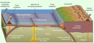 Los materiales del interior de la Tierra están en constante movimiento debido a diversos factores. Un de ellos es el propio tirón gravitatorio de las placas que subducen. Además, el calor interno del planeta forma corrientes de convección que, partiendo de la capa D’’, recorren todo el manto y llegan a la corteza. Todos estos movimientos son los responsables de la mayor parte de los fenómenos geológicos terrestres: Orogénesis o formación de montañas. Se producen al “arrugarse” la corteza en el choque de dos placas. Vulcanismo por el ascenso del magma generado en el interior terrestre, habitualmente, en las zonas de subducción. Este vulcanismo puede ser oceánico (arcos de islas, cadenas de volcanes submarinos) o continental (cordilleras pericontinentales). Terremotos ocasionados por el roce entre placas y el desplazamiento de las mismas. Expansión del fondo oceánico al separarse dos placas en las dorsales. Deriva continental al moverse las placas sobre las que se hallan los continentes.
