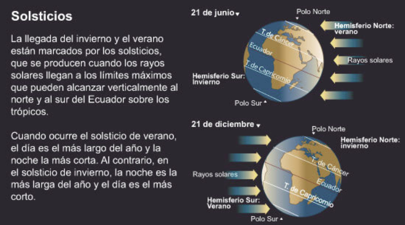 Si el eje terrestre fuera perpendicular, en todas partes habría 12 horas de día y 12 de noche. Sin embargo, el eje de rotación de la Tierra está inclinado unos 23º con respecto a la Eclíptica y ello ocasiona dos consecuencias: DIFERENTE DURACIÓN DEL DÍA Y LA NOCHE Cuando un hemisferio de la Tierra apunta hacia el Sol recibe más horas de luz y los días son más largos. En el hemisferio opuesto sucede lo contrario. Por ello, en nuestro país, los días de junio y julio son muy largos y los de diciembre y enero muy cortos. CAMBIA LA INCLINACIÓN DE LOS RAYOS SOLARES En verano los rayos caen más perpendicularmente y, por tanto, calientan más que en invierno. Esto es así para cada hemisferio. En conclusión: la inclinación del eje terrestre y el movimiento de traslación alrededor del Sol ocasionan las estaciones.