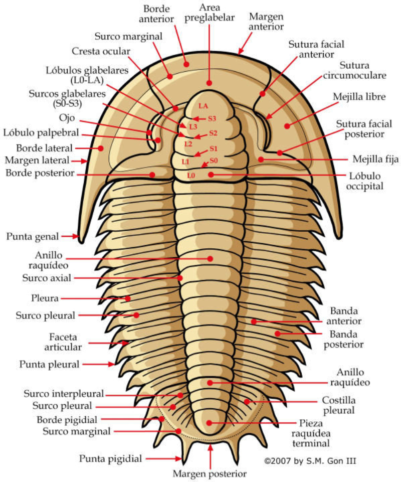 TRILOBITES Artropodos marinos del Paleozoico. Presentaban un caparazón con tres partes: cefalón, tórax y pigidio. El cefalón es semicircular, con una zona central o glabela y dos laterales o mejillas. Sobre las mejillas estaban los ojos compuestos, como los de los insectos. Cada segmento del tórax presentaba un par de apéndices locomotores y con branquias. GRAPTOLITES Del Paleozoico temprano. Marinos, microscópicos y coloniales. Sus fósiles aparecen en pizarras en forma de trazos dentados (rabdosomas). Cada rabdosoma era una colonia y en cada ‘diente’ había un individuo. Podían vivir en los fondos o flotando. AMMONITES Del Mesozoico. Están emparentados con calamares y pulpos actuales. Moluscos cefalópodos marinos con conchas en forma de espiral, con compartimentos internos (cámaras). El animal vivía en la última y mayor de las cámaras. El resto, llenas de líquido y gas, les permitía flotar. En el exterior tienen una línea de sutura (línea de unión de los tabiques de las cámaras, a veces muy compleja) y, en ocasiones, costillas, engrosamientos radiales de la concha. NUMMULITES Animales marinos del Paleógeno. Eran protozoos unicelulares foraminíferos, con pseudópodos para desplazarse y alimentarse. Tenían un caparazón en espiral y con forma de disco, con multitud de cámaras por donde extendía sus pseudópodos. CALAMITES Planta del Carbonífero. Equiseto gigante (hasta 30 metros), con el tronco hueco y con nudos y entrenudos, como las cañas actuales.